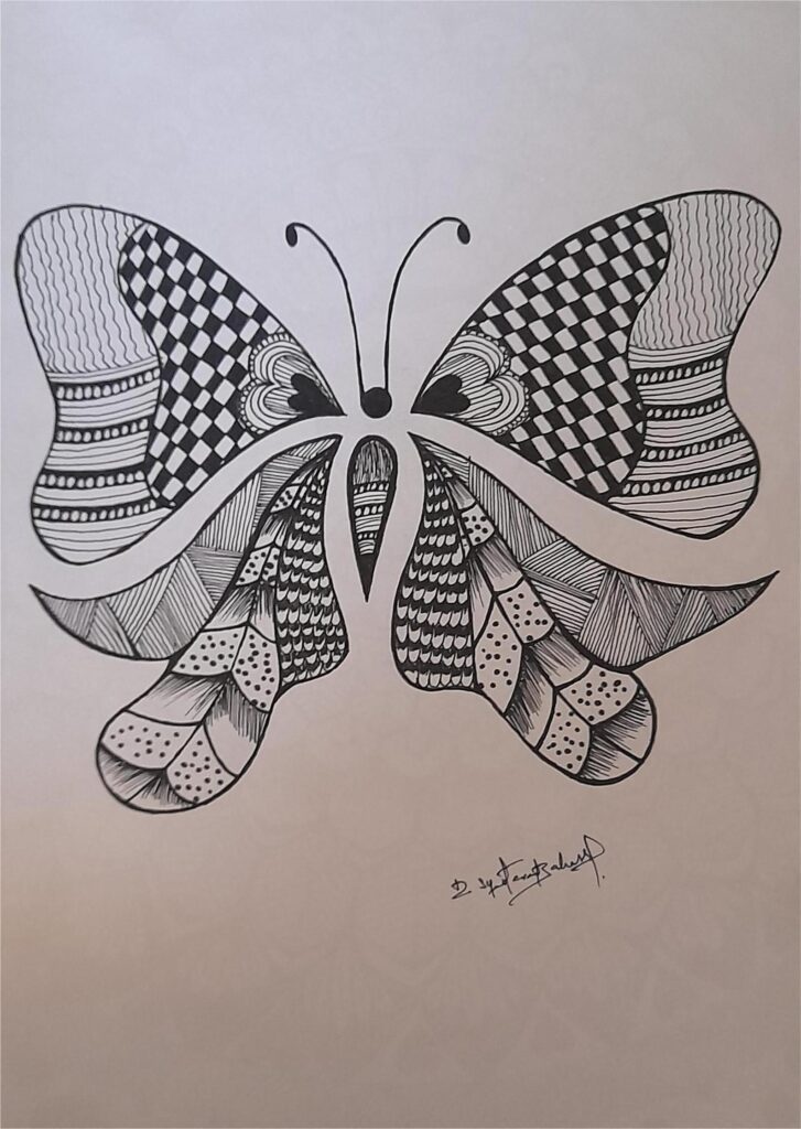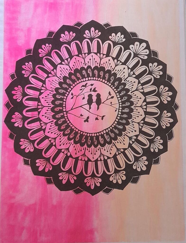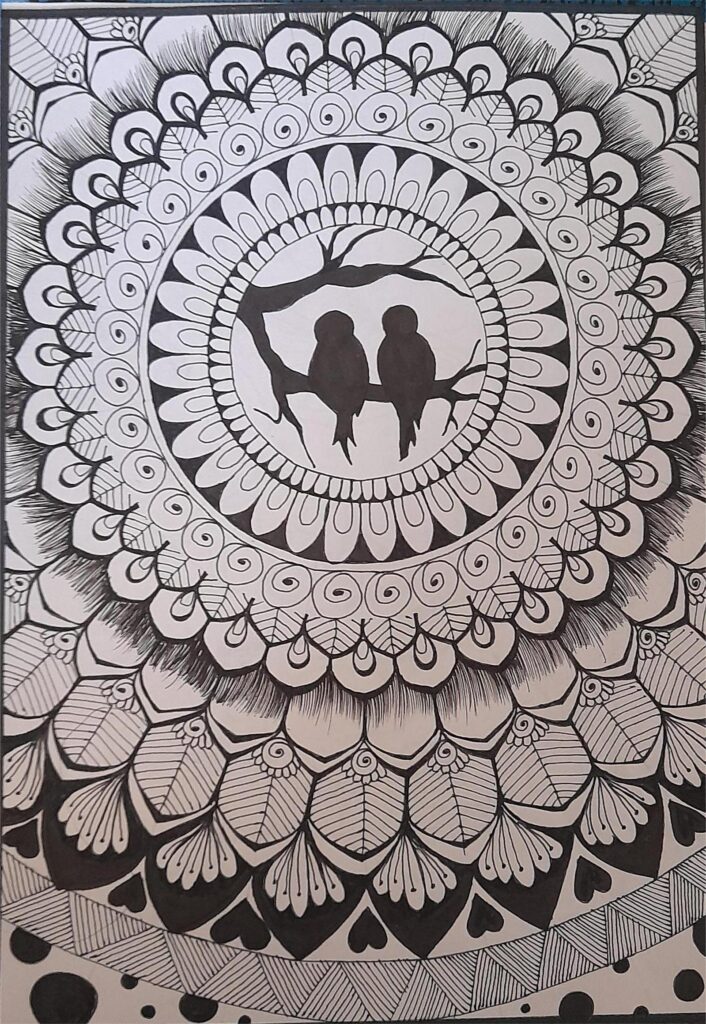 பால்வாடி வயதிலேயே தொடங்கிய கிறுக்கல்கள், சிறு வயதில் கார்ட்டூன் வரைவதில் கண்ட மகிழ்ச்சி, பின்னர் முகங்களையும் பல்வேறு ஸ்டைல்களையும் வரைய வழிகாட்டியது. பென்சில் ஸ்கெட்ச், இங்க் ஆர்ட், மண்டலா, நிற ஓவியங்கள் ஒவ்வொன்றிலும் நான் எனது ஒரு பகுதியைக் கண்டேன். என் பெற்றோரின் தொடர்ந்த பாராட்டுகளும் ஆதரவும் என் வரைதலுக்கான பயணத்திற்கு வேராகின. அவர்களின் ஊக்கம் என் நம்பிக்கையை உருவாக்கி, இந்த உலகில் எனக்கு ஒரு தனி இடம் உள்ளதாக உணர்த்தியது. வாழ்க்கை முன்னேறியபோது, வேலைப்பளு அதிகமானாலும், கலை என் அன்றாடத்தின் ஓர் இருப்பாக இருந்து வருகிறது. நேரமில்லை என்றாலும், கிடைக்கும் சில நிமிடங்களில் வரையும் ஒவ்வொரு கோடும் மன அழுத்தத்தைக் குறைத்து என்னை எனக்கு அருகில் கொண்டுவருகிறது. நிறைய மாற்றங்களின் நடுவிலும், ஓவியக்கலை எப்போதும் என் பக்கத்தில் இருக்கும் நிலையான துணையாகத் தொடர்கிறது.